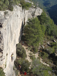 Siurana des de dues vessants, orogràfiques i d' activitat....dissabte, excursió en familia cap a Gallicant, des d' on albirem desenes de furgonetes a l' aparcament i tot de punts de colors trepant a la solana..diumenge ens toca a nosaltres; matinal productiva a Grau de Masets. Pugem amb el JL i cia, el Joan i cia, el Feliu i cia, o sigui jo...El JL i el Joan tenen a punt la Muerte del sponsor 7b+. No ens han de convencer gaire, ja fa massa temps que la tinc pendent...Escalfem repetint Aleva 6b+, així puc encadenar el que vaig desencadenar l' altre dia. Acte seguit el Feliu es treu l' espina de Litlle Ted 7a+, que ja tinc al sac doblat...ara a la feina. Aprofitant les cintes posades faig una passada d' inspecció a la Muerte..festival regletero, amb alguns passos tensos...al tanto amb els vuelos, que excepte el darrer, son en placa...